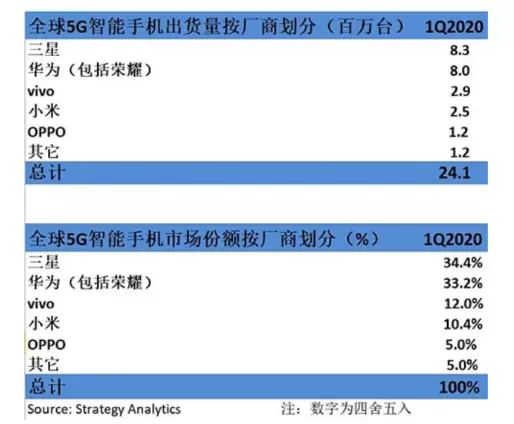 根据知名市场调研机构Strategy Analytics发布的最新数据显示,2020年Q1,全球5G智能手机出货量激增,超过2400万部。其中vivo排名全球前三,市场份高达额达12%,超过了小米等一众手机厂商。