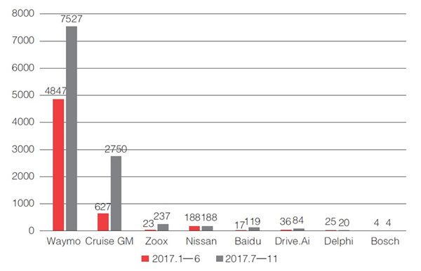 2018年以来,随着人工智能技术带来的各种改变,例如对工作的威胁,对个人大数据信息的精准分析,引起了全球各国人们的普遍恐慌。规避风险是人的天性,但不是发展的目的。托马斯·阿奎那(Saint Thomas Aquinas) 曾经写道:“如果船长的最高使命是保护他的船只,那么他永远只会停留在港口。”和其他所有创新类似,人工智能的最终目标是促进人类社会的发展,而安全是发展的一部分。过度担忧在一定程度上会阻碍技术的发展。下面以无人驾驶为例来说明这个问题。当前无人驾驶技术发展全面加速。尽管2018年出现了两起无人驾驶致命车祸,但大部分无人驾驶汽车公司的发展并没有受到影响。自动驾驶的人工智能发展不能只局限于实验室,同时也需要大量的实际路况测试和数据训练。通过公路的无人驾驶实际运行,让驾驶AI学习规范、合法和安全的驾驶,不断修复存在的系统问题。当前美国有部分州政府通过了无人驾驶公路测试法案,其中加州对无人驾驶发展的支持最为积极。根据加州车辆管理局的报告,2017年无人驾驶车辆的实际公路测试中,测试车辆以完全无人干预的自动驾驶模式运行的里程数超过50万英里。其中Waymo(谷歌拆分出来的自动驾驶公司)和Cruise(通用汽车子公司)自动驾驶测试里程数最多。下图是加州车管局(DMV)公布的2017年1至11月各公司汽车自动驾驶平均里程数(自动行驶距离/人为干预次数)。