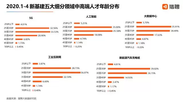 从细分领域来看,5G、大数据中心、人工智能、工业互联网、新能源汽车充电桩领域这五个领域的中高端人才大体和新基建总体中高端人才的年龄结构类似,都是25-35岁的群体占比最多,在更细的年龄结构层面,各领域存在一些差别。