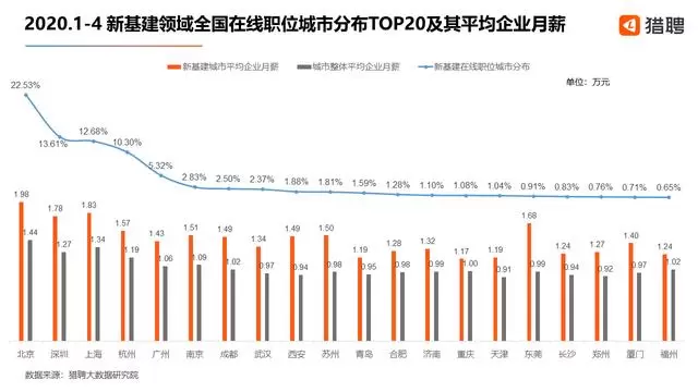 从新基建在线职位分布前二十的城市对应的薪资来看,这20个城市新基建的平均企业月薪均高于当地全行业的整体平均企业月薪。