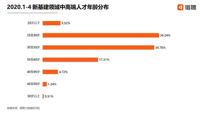 此外,中年人才也具有举足轻重的作用,猎聘大数据显示,新基建领域30-35岁的中高端人才以微小的差距次于25-30岁的人才,占比为34.76%。35-40岁的中高端人才占比位列第三,为17.21%。