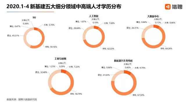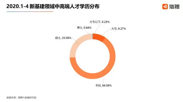 从新基建总体中高端人才的学历分布来看,本科学历的人才占比为64.58%,硕士学历的人才占比为25.08%,两者合计为89.66%;博士学历的人才占比为084%。这表明新基建人才普遍具有良好的教育背景,基础素质过硬。