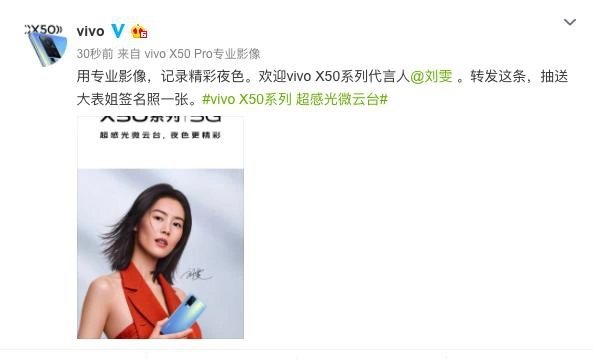 2020年5月25日,vivo官方微博正式宣布,刘雯将代言vivo X50系列旗舰级影像手机:“用专业影像,记录精彩夜色。欢迎vivo X50系列代言人@刘雯 ”。熟悉vivo的用户对刘雯一定不会陌生,她已经是我们的老朋友了。在产品时尚外观审美方面,vivo与刘雯高度一致,如何将时尚与合计相结合,X50系列将给出正确答案。