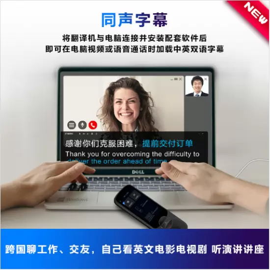讯飞翻译机3.0的同声字幕功能,是将翻译机与电脑连接并安装配套软件后,即可实现将电脑中声音实时转换成中英双语字幕。在与外国客户谈生意、跨国和同事聊工作、与海外友人聊人生时既能跨越地域的限制,也能跨越语种的阻隔。
