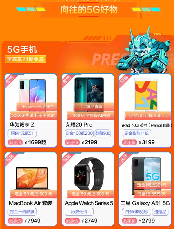 有句俗语说得好,过了这个村就没这个店了啊。那么,此次京东“5G好物盛典”优惠活动有哪些机型值得入手呢?千元5G手机华为畅享Z预付1元定金抵50元优惠,下单就送“30天无忧试用服务,不爽全额退款”服务;荣耀30 Pro支持白条24期免息,每天低至5.5元;5G新品vivo iQOO Z1支持12期免息,618全程享受价格保护,领券减200元;华为nova6享12期免息,还送2400G流量,都是5G好物,数码控圈子里的爱好者们可不要错过啦。
