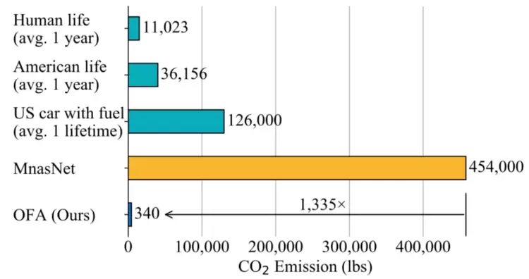 蔡涵: 如果我们直接在所有硬件平台上使用同一个神经网络,这会导致大量性能和效率上的损失,因为同样的神经网络并不能适配所有场景。如果我们针对每个硬件平台和效率约束都重头设计并训练一个新的神经网络,这会导致大量的计算资源的消耗,因为这种方式计算资源的需求是随着部署场景数线性增长的。这同样也会导致严重的环境问题,因为大量的计算资源消耗直接可以转化为大量的二氧化碳排放。因此我们需要这样的通用的 OFA 网络,既可以针对不同硬件平台进行适配而不损失性能和效率,同时不需要额外的计算资源来从头训练一个新的神经网络。