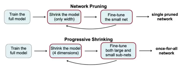 蔡涵: 主要的难点在于,一个 OFA 网络需要同时支持大量不同的子网(>10^19)。它们之间会相互干扰,这使得 OFA 网络比一般结构确定的神经网络要更难优化。为了解决这个问题,我们提出 progressive shrinking 算法来训练 OFA 网络。我们注意到各种不同的子网是一层层嵌套在最大的神经网络中的。因此我们将 OFA 网络的训练过程建模为一个逐渐缩小与微调的过程。我们首先会训练最大的网络。然后逐渐缩小网络的各个维度(输入分辨率,卷积核大小,深度,宽度)来支持较小的子网。同时我们会微调网络的权重使其在支持较小的子网的同时不会丢失在较大子网下推理的能力。某种程度上,progressive shrinking 也可以看作是一种广义上的剪枝方法。