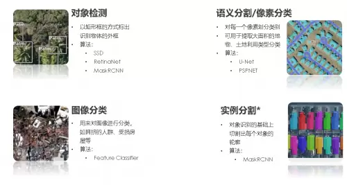 在ArcGIS 10.8中,新增支持6个深度学习模型,分别是目标检测模型SSD和RetinaNet,像素分类模型UNet和PSPNet,图像分类模型Feature Classifier,以及实例分割模型MaskRCNN,全面覆盖4大场景。