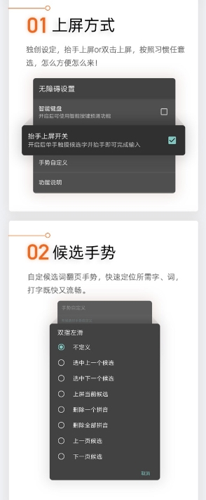 其次,针对用户对于无障碍键盘的不同使用习惯,搜狗输入法还独创了上屏方式和候选手势的自定义功能,用户不用再花时间适应输入法规则,可以根据自己的使用习惯和个人偏好,进行自定义设定,降低用户的学习成本,提升用户的输入效率。