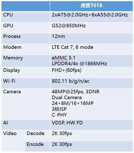 虎贲T618是紫光展锐在2019年8月发布的一款8核架构LTE芯片平台。小编找来了这款平台的基本配置: