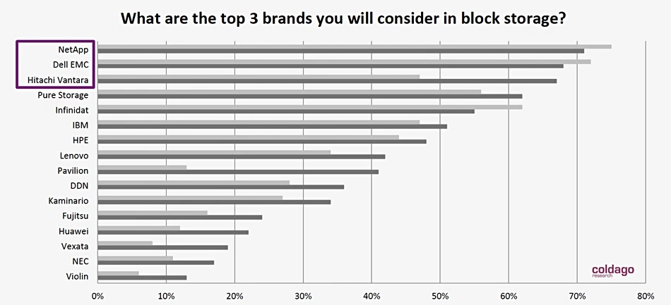 根据数据存储研究机构Coldago Research的2020终端用户调研,Hitachi Vantara被用户评为块存储领域的领导者。坚持不懈的技术创新让Hitachi Vantara的存储解决方案一直深受用户信赖,尤其是那些更需要高可靠IT基础设施的业务关键型应用。
