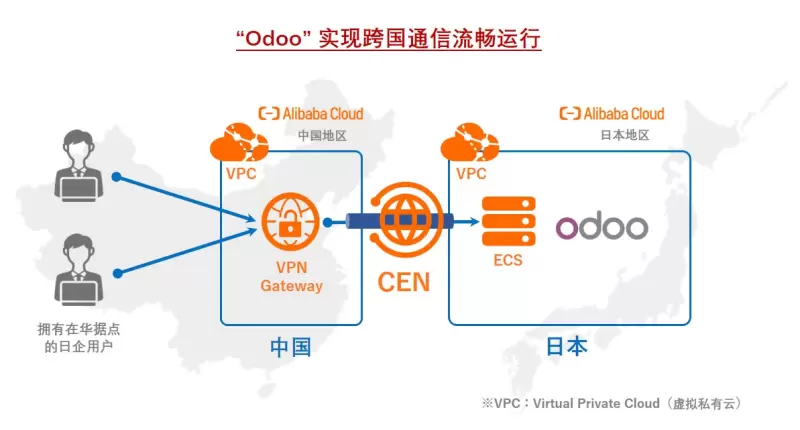 此次双方合作,企业可以在阿里云的云服务器ECS(ElasticComputeService,东京地区)上构建由文思海辉提供的云ERP“Odoo”的系统环境。同时,通过阿里云云企业网中日专线及由VPN与中国的私人网络连接的“VPNGateway(VPNGW)”,实现中日通讯高速稳定,确保企业跨国通讯的顺畅运行。此外,“Odoo”可远程操控、便捷管理,无需专业IT人员进行维护,缩减人力成本,为企业带来降本增效的提升。