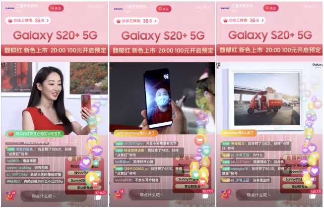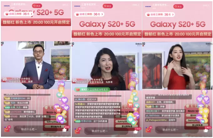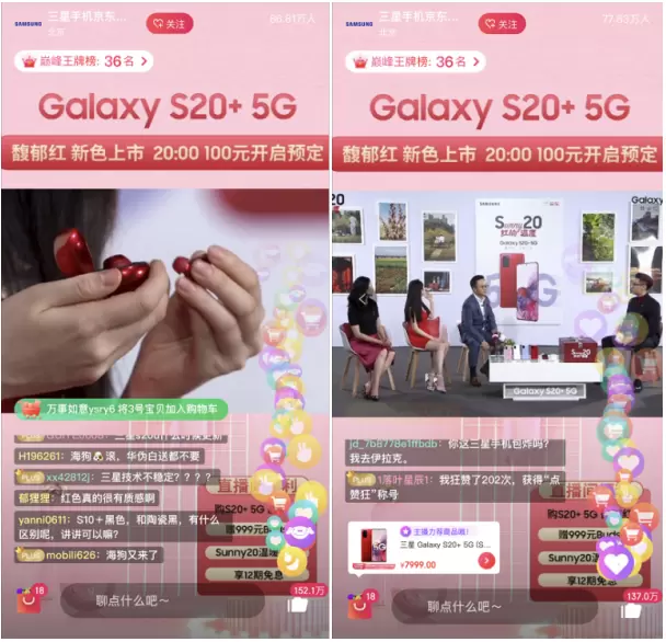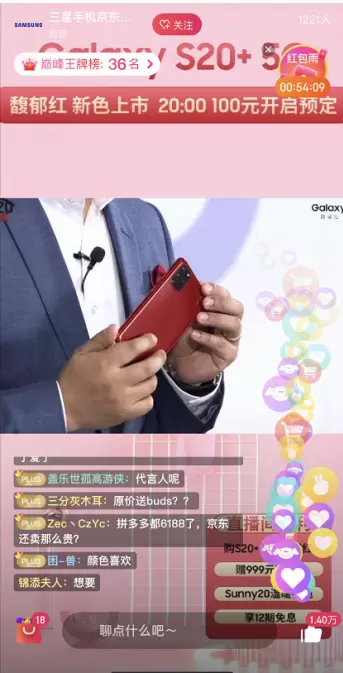 三星电子大中华区移动通讯部吴维部长及高级市场总监马乔奇女生莅临直播间,S20+馥郁红温暖大使蒋梦婕也带着红的温度礼包空降直播间,直播期间最高在看人数接近120万,三星Galaxy S20+ 5G馥郁红配色可谓露面即红,直播间更是充满了温暖的红色感动。