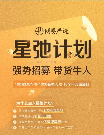 5月26日,网易严选发布“星驰计划”,计划面向抖音、快手、微博、淘宝等全网招募1000名优质红人主播、100家MCN机构,共创10个千万级爆品。