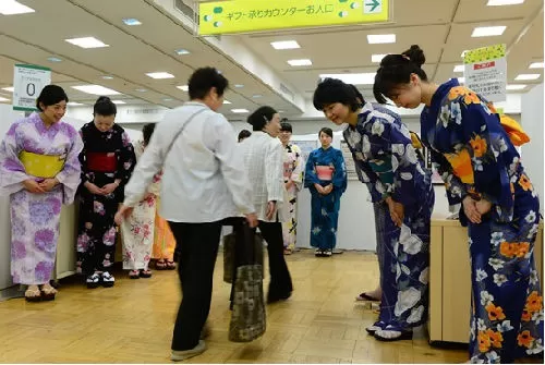 日本某百货公司员工向顾客鞠躬表示欢迎。