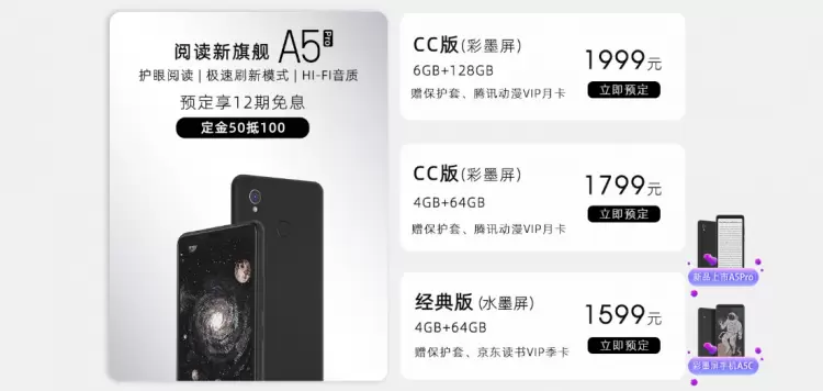 根据销售页面信息显示,现在预定阅读新旗舰A5Pro系列的用户,不仅可以享受定金50元抵100元的优惠活动,还可以享受12期白条免息。另外,成功购买彩墨屏阅读手机A5ProCC版的用户,还可以免费获赠定制保护套以及腾讯动漫VIP月卡;如果用户购买的是彩墨屏阅读手机A5Pro经典版,则可以免费获赠定制保护套以及京东读书VIP季卡。