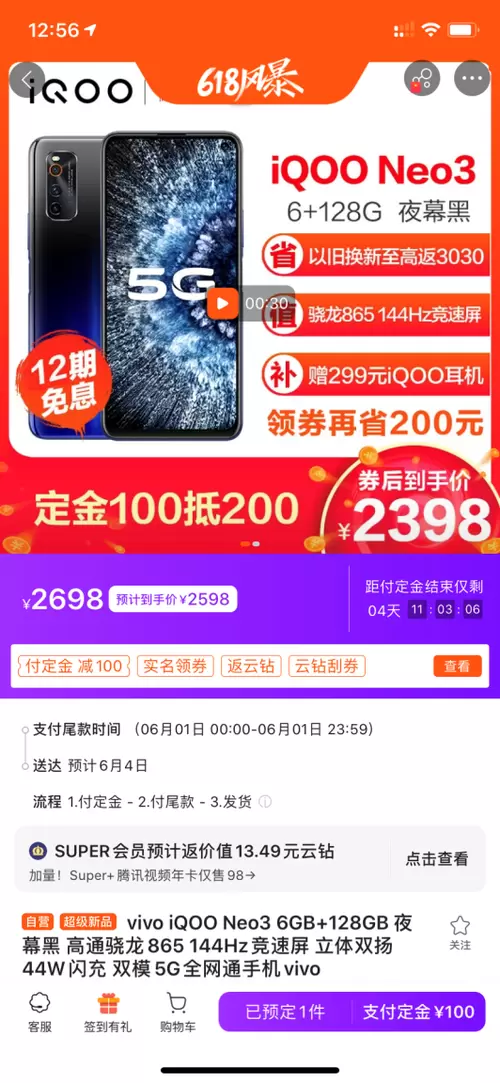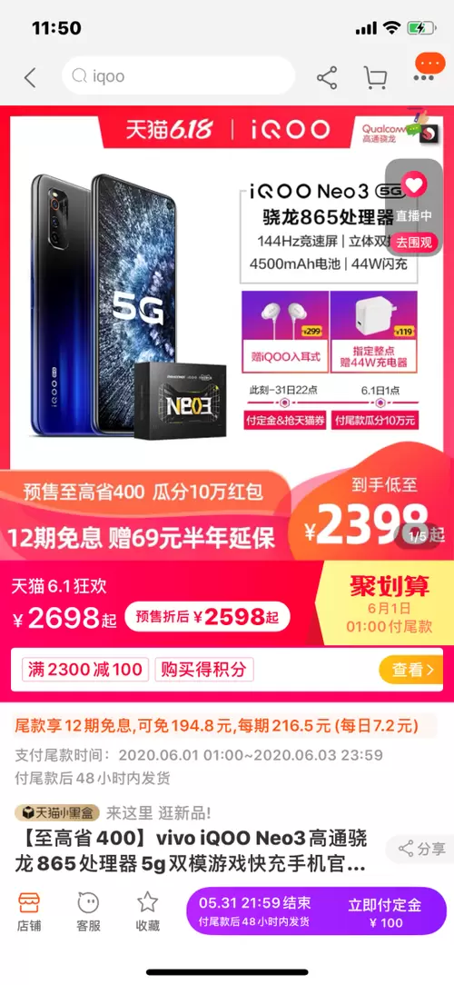 特别提醒:这里iQOO Neo3最终2398入手价,是在平台发放商品优惠券前提下才有的,是618活动的限时优惠价格。一旦活动时间错过,iQOO Neo3将恢复原来的价格,并且像12期免息分期、以旧换新至高返3030、赠送299元iQOO耳机等多种福利也都不会有了。所以说,想要以最低的成本入手一款最新5G旗舰手机的朋友们,可得把握住这次的机会啦。
