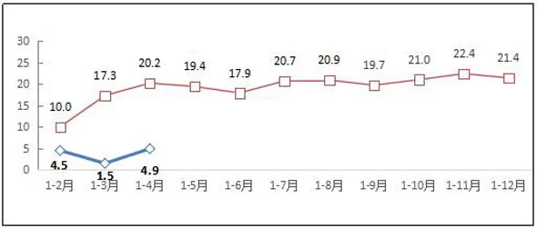利润方面,行业利润扭转下滑局面。1-4月,全行业共实现营业利润327.3亿元,同比增长4.8%,扭转1-3月下滑(-24.9%)局面,仍低于去年同期29.1%。