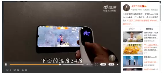 实测数据显示:一局高帧率游戏结束后,Redmi10X正面机身温度34度(时常约40分钟)