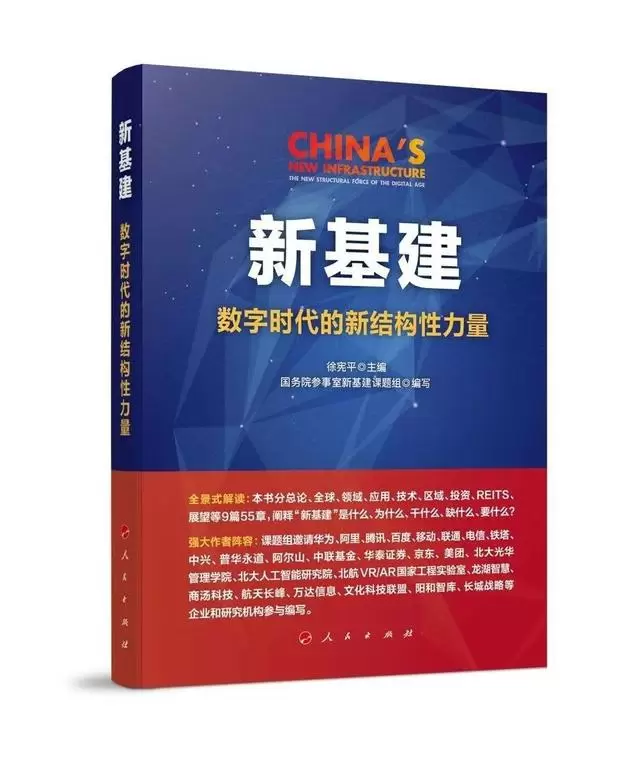 据了解,《新基建:数字时代的新结构性力量》由国务院参事室新基建课题组编写,并组织国内新基建领域主要企业、协会联盟、科研院所等机构共同参与编写。记者从课题组获悉,新书分总论、全球、领域、应用、技术、区域、投资、REITS、展望等9篇55章,通过全景式解读阐释"新基建"是什么、为什么、干什么、缺什么、要什么等关键点,为中国经济的"高质量投资"与"高质量发展"提供重要的依据和关键路径。