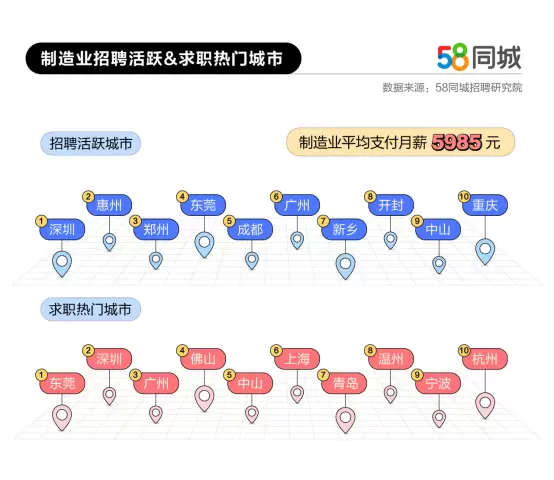 58同城制造业就业数据:求职需求整体同比增长超15%,企业平均支付月薪5985元