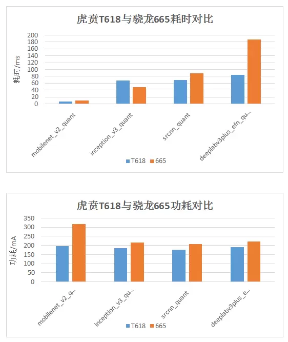 从能效比层面看,四个模型综合对比下来,骁龙665的VDSP平均功耗是虎贲T618的 1.25倍。虎贲T618的处理模型平均速度比骁龙665快1.28倍,能效比是骁龙665的1.6倍!