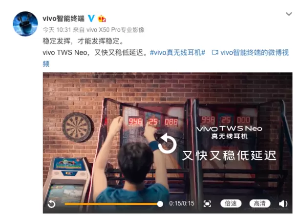 2020年5月29日,vivo智能终端微博发布一段视频,突出即将于6月1日发布的vivo TWS Neo真无线耳机的产品特性:“稳定发挥,才能发挥稳定。vivo TWS Neo,又快又稳低延迟。”。作为一款真无线耳机,vivo TWS Neo的主要卖点可谓是一针见血,即稳定和低延迟,加上之前曝光的“好音质”概念,vivo TWS Neo真无线耳机已经是一款完全成熟且极具市场竞争力的产品了。