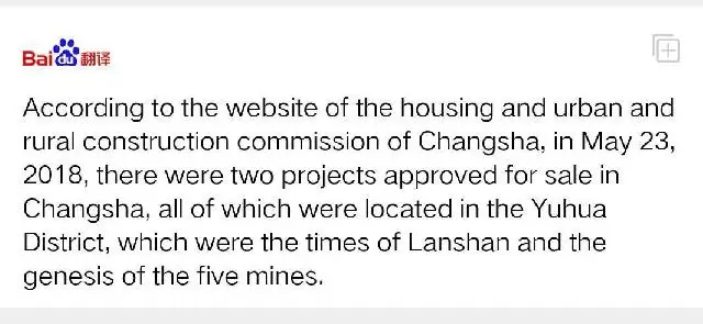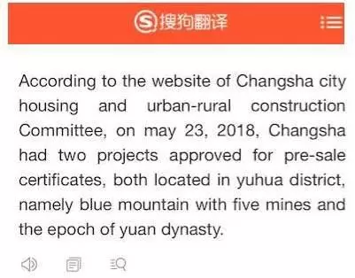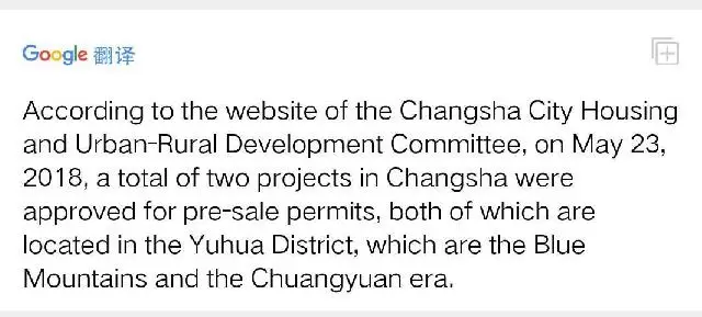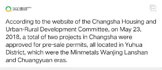 原文:据长沙市住房和城乡建设委员会网站显示,2018年5月23日,长沙共计有两个项目获批预售证,均位于雨花区,分别为五矿万境蓝山和创元时代。