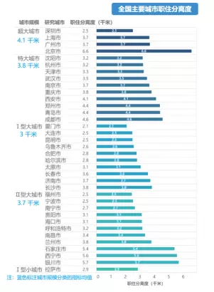 在超大城市中,北京的职住分离度最高,居民需要到离居住地6.6公里外的地方才能找到一份工作;而上海与广州需要3.7公里,深圳只需2.5公里。在以厦门、大连、昆明等为代表的Ⅰ型大城市(城区常住人口300万~500万)中,职住分离度保持在2.1至3.8公里之间,城市职住空间的平衡性较好。而对于Ⅱ型大城市(城区常住人口100万~300万)中的银川、西宁、石家庄等职住分离度大于5公里的城市,则反映出了城市郊区化发展和新区建设的阶段过程。