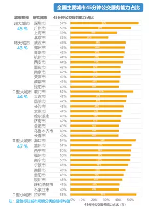 在路程耗时方面,《报告》指出,45分钟通勤时间是合理通勤的基本保障,也反映了公交系统与职住空间的契合程度。45分钟公交服务能力比重越高,说明公交系统对城市通勤的保障越好。目前能保证最多上班族在45分钟到达目的地的城市为深圳,公交服务能力最强。与深圳同为超大城市的上海和北京,公交服务能力则不尽如人意,分别为39%和32%。其他公交服务能力较高的城市依次为拉萨、海口、厦门、兰州和广州。