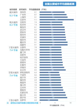 与职住分离度不同,通勤距离是指从家到实际就业地的距离,中心城区通勤人口的平均通勤距离,是城市职住分离情况的真实写照。据《报告》显示,36个城市的平均通勤距离均超过6公里,且城市规模越大,平均通勤距离越长。其中北京以11.1公里的平均通勤距离位居榜首,上海、重庆、成都和西宁紧随其后,平均通勤距离也都超过9公里。而平均通勤距离越大,意味着居民的通勤成本越高,城市就更需要高效的交通系统来支撑。