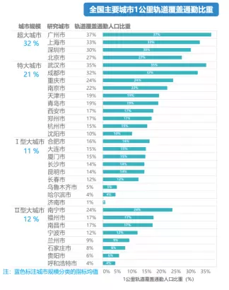 除公交服务之外,地铁、城铁等轨道交通对城市空间格局演变也起到了重要的骨架作用,有效提升城市的就业可达性,拉近新城和城市中心区的联系。《报告》指出,家和就业地两端均在轨道站点1公里覆盖范围的通勤人口比重,体现了轨道线网与职住空间组织的匹配度。在36个主要城市中,广州、武汉分别以37%和35%的轨道覆盖通勤人口比重占据第一、第二位,轨道布局更加满足通勤需求。