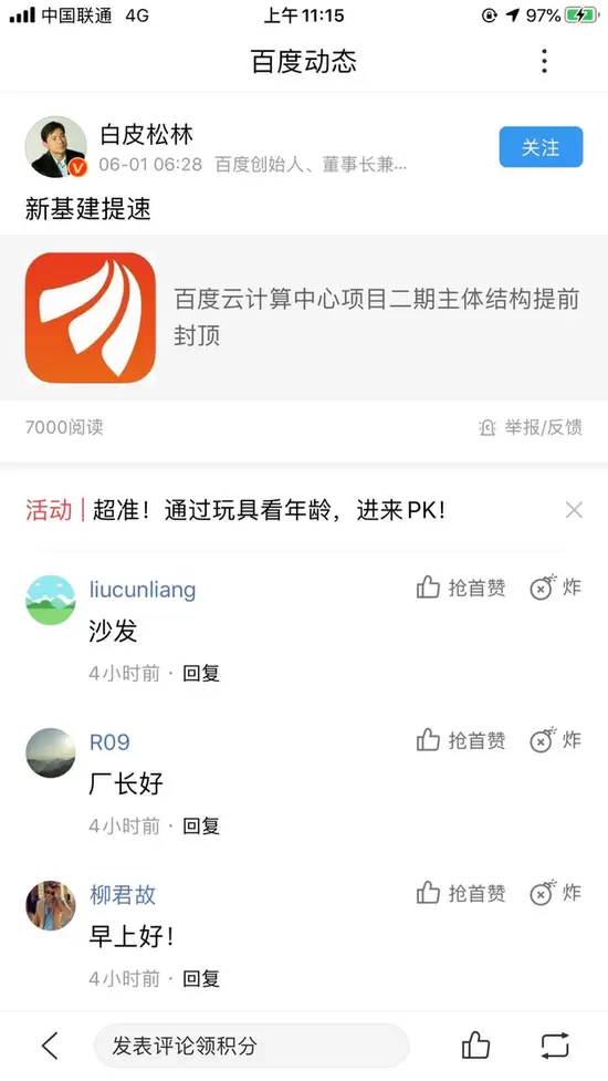 6月1日上午消息,今天百度CEO李彦宏在其百家号动态中转发“百度云计算中心项目二期主体结构提前封顶”一文,并评论:新基建提速。