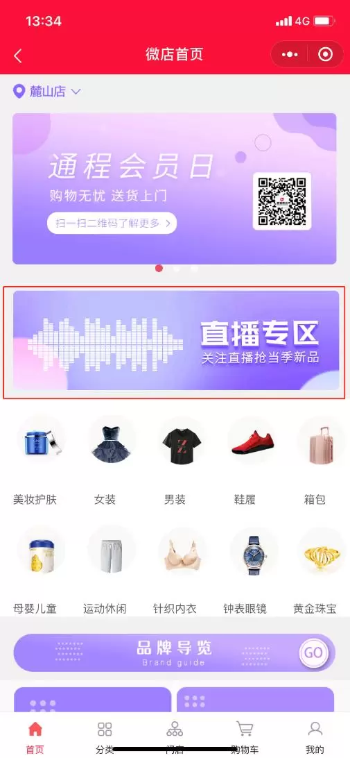 小程序以线下商场布局为参照,搭建线上“云商城”。用户进入小程序后,可以自由选择线下商城对应的小程序店铺,首页采用楼层和品牌分类指引,哪一层楼有哪些品牌和专柜,线上线下一一对应。