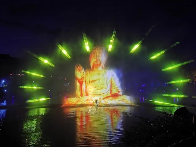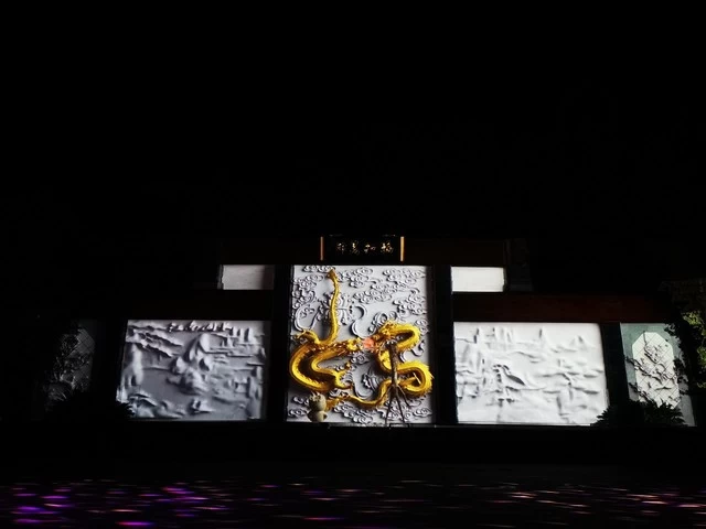 夜宴开篇,由NEC4万流明双色激光工程投影机打造的“盘根化龙”光影秀,让白天里平凡无奇的浮雕照壁在投影技术下把活字印刷、脸谱艺术等中华瑰宝一一呈现。随腾飞巨龙步入湖区之上,NECPH3501QL+打造的水幕电影,以水之无形相万佛之景,光影折射中演绎了佛陀故事。华东第一光影秀的盛装演绎,让我们看到了一个开化特色小镇释放的文旅产业投资和消费潜力。同时,利用高科技手段打造文化与生态的珠联璧合,值得其它特色小镇夜游项目借鉴。