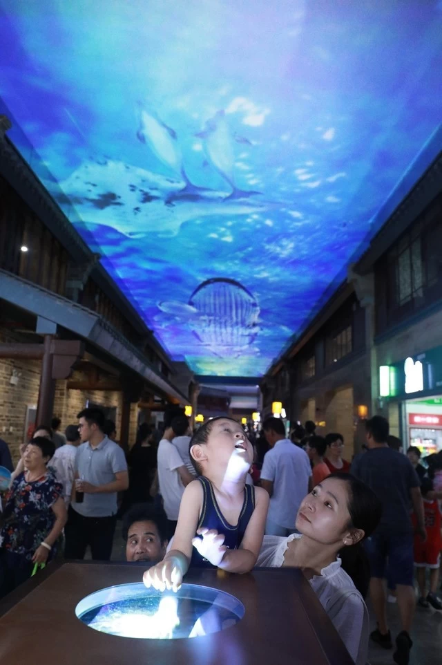 在文化街地下商业部分,美轮美奂的天幕成为一大亮点。21台NECPX1004UL+激光工程投影机,采用竖投、融合的投影技术营造出230米超长天幕,带给市民和游客无限惊喜和遐想。来到地上的戏台广场,运用5台PX803UL+激光工程投影机打造的古戏台光影秀映入眼帘,在古老戏台上唱一出科技大戏,凸显出历史文化古街的主体特色。