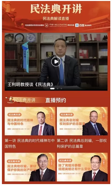 5月28日至6月3日,百度APP联合中国人民大学法学院联合制作推出独家普法直播节目——《民法典开讲》,中国人民大学常务副校长王利明教授、中国人民大学法学院院长王轶教授等多位参与编纂《民法典》的专家和资深法学教授在线"传道受业解惑",面向社会大众全面解读《民法典》对人们工作、生活的意义和影响。