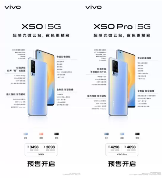 即日起,vivo X50系列手机已在vivo官网、vivo京东自营官方旗舰店、京东vivo官方旗舰店、天猫vivo官方旗舰店、vivo手机苏宁自营旗舰店、天猫苏宁易购官方旗舰店、拼多多、分期乐、唯品会、招商银行掌上生活、平安口袋银行APP、vivo体验店专卖店、vivo终端各大门店等线上线下渠道开启预售。预售期间至高享24期分期免息,并加赠半年碎屏宝。 6月6日,vivo X50 正式开售;6月12日,vivo X50 Pro 正式开售。敬请关注。