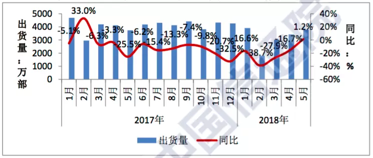 2018年5月,国内手机市场出货量3783.6万部,同比增长1.2%。2018年1-5月,国内手机市场出货量1.59亿部,同比下降19.0%。