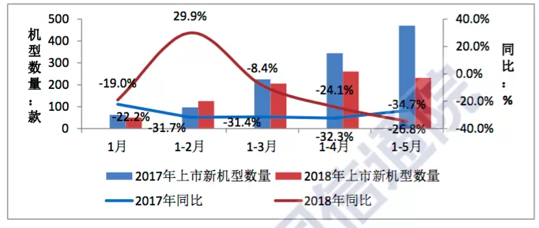 5月份,国内手机上市新机型数量减少明显。根据报告,2018年5月,上市新机型62款,同比下降50.8%,上市新机型中含2G手机9款、4G手机53款;2018年1-5月,上市新机型323款,同比下降31.3%,上市新机型中含2G手机69款、3G手机2款,4G手机252款。