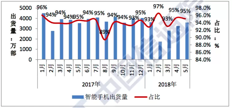 5月份出货的手机中,智能手机占主导位置。2018年5月,智能手机出货量为3598.1万部,同比增长1.7%,占同期国内手机出货量的95.1%,其中Android手机在智能手机中占比89.8%。2018年1-5月,智能手机出货量为1.51亿部,同比下降19.1%,占同期国内手机出货量的94.4%,其中Android手机在智能手机中占比为86.9%。