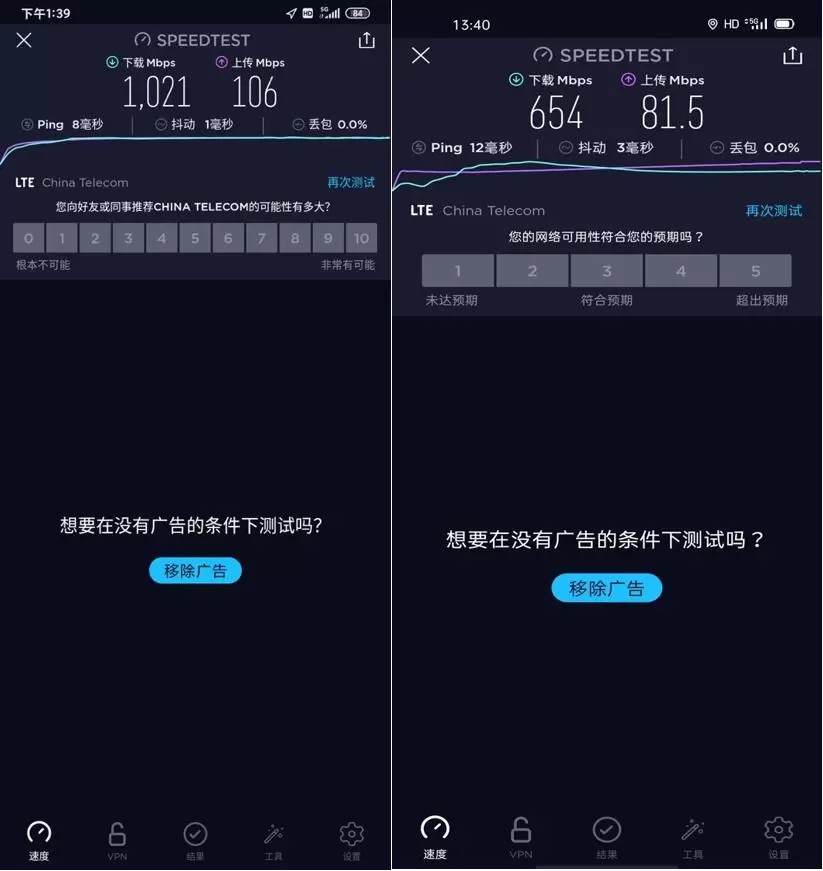 我们再看看权威测试软件SpeedTest的测试结果,网络环境选择中国电信LTE 5G网络,同时用一台搭载高通骁龙765G芯片的手机与Redmi 10X进行对比。数据显示,Redmi 10X的5G网络下行速率最高1021Mbps、上传速率106Mbps,而搭载骁龙765G芯片的手机下行速率为654Mbps、上传速率为81.5Mbps。可以看到,Redmi 10X在5G下行速度方面,对比同级产品几乎有翻倍的优势!而上传速率也有30%左右的大幅超越。