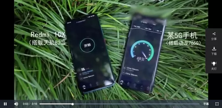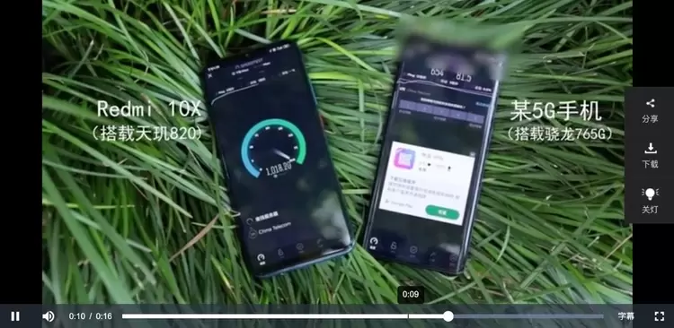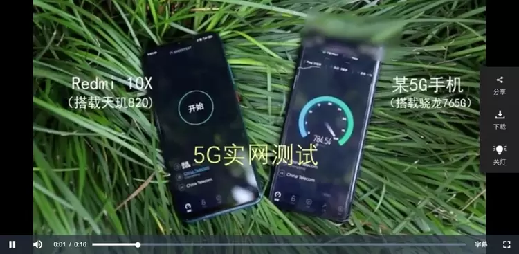 从视频中的数据不难看出,搭载天玑820的Redmi 10X在实网测试中以1000Mbps以上的成绩远远超过同级!