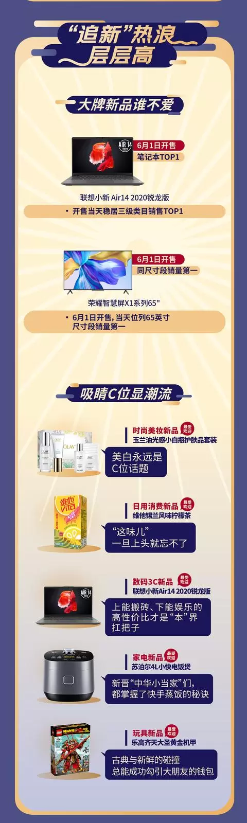 京东消费者对新品旺盛的热情体现在一骑绝尘的消费力上,上能搬砖、下能娱乐的高性价比本联想小新Air14 2020锐龙版笔记本开售当天稳居三级类目销售TOP1,荣耀智慧屏X1系列65寸6月1日开售后跃居65英寸尺寸段销量第一!