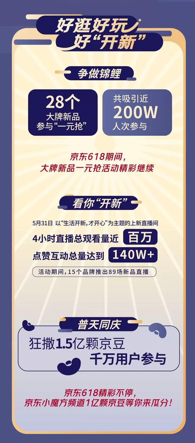 在京东小魔方"年中大势新品赏"之后,更加精彩的京东618新品狂潮即将袭来,预计期间将有2亿件新品售出,接下来,更多新品还将持续发布,更加多元的玩法和权益也将不断释放。