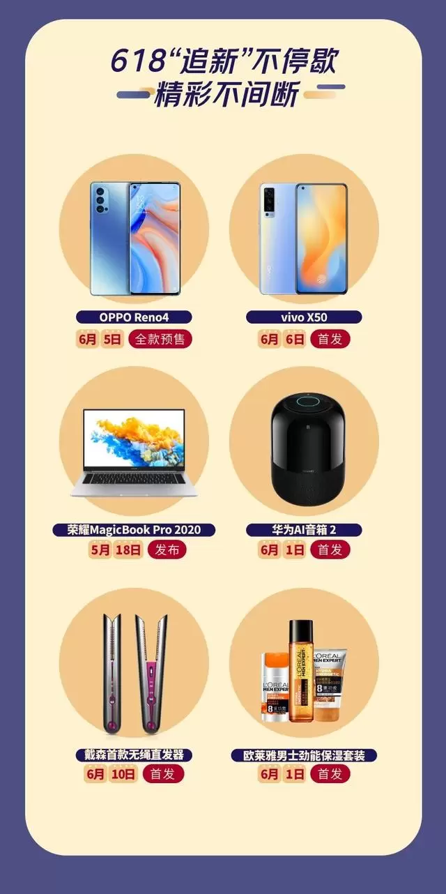京东618期间手机数码类目将会迎来新品大爆发,具有超级夜景功能的5G视频手机OPPO Reno4将于6月5日全款预售,超感光微云台vivo X50将在6月6日首发,黑科技超稳运动拍摄,祝你稳出好影像!新品华为AI音箱 2不仅配备有能说会道的AI语音助手小艺,还有海量的1亿+有声内容要做孩子的良师益友;荣耀MagicBook系列的新成员荣耀MagicBook Pro 2020高颜值实力派,简直全方位满足了当前年轻用户对于笔记本的幻想;