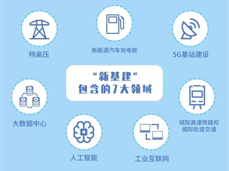 2020年开始的新基建方向是科技端的基础设施建设,主要包括七大领域:5G基站、特高压、城际高速铁路和城际轨道交通、新能源汽车充电桩、大数据中心、人工智能和工业互联网。接近50万亿元的国内投资正等待上马。根据25个省区市公布的未来投资规划,中国将有2.2万个项目,49.6万亿元总投资额等待上马。其中,落到2020年度计划投资总规模为7.6万亿元。