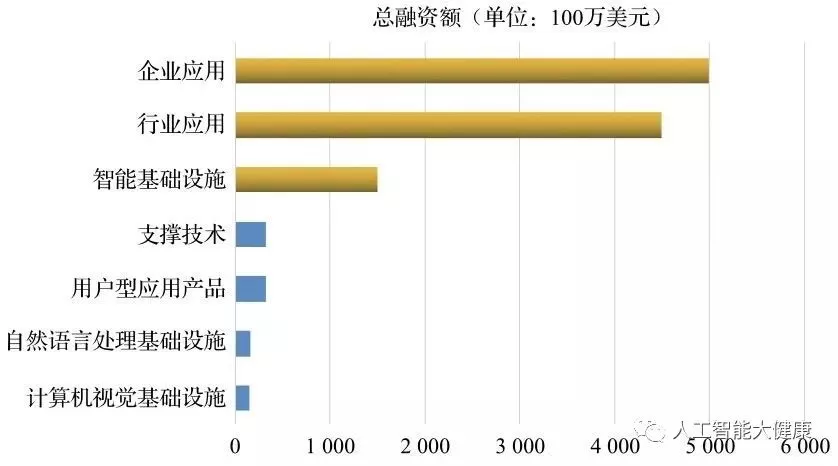 由于这个点往往是面向企业的业务,所以大众会比较陌生,但其实在美国这是落地最多的方向。这个方向的状态和图像有点像,在每一个垂直的方向都可以优化出很有用的系统,但没办法做出通用的系统。比如有的公司会根据医疗诊断数据以及你的财务状况直接提供性价比最高的治疗方案,但这样的系统就不能扩展用来做金融欺诈检测。这个方向其实比上面所有的方向都更能吸引投资,因为它的收益往往更加直接。换个视角,这种后端数据整合工作也可以看成是在为前端的智能助手等储备能量,一旦它成熟到一定程度,并接入某个终端比如亚马逊的Echo,那么Echo的力量就会瞬间增强。图4-1是到2015年年底风险投资在各个与人工智能相关领域的投资分布统计,看了之后,我们会惊讶地发现最主要的投资确实是落在企业和行业应用(下图中标为黄色的领域)这些我们不太关注的领域里,这可以从侧面证明这个领域确实是整个人工智能图谱中成熟度最高的。