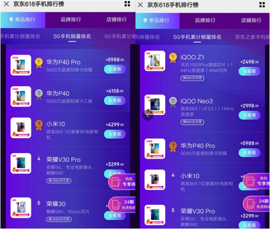 在5G手机销量排名方面,华为持续遥遥领先,华为 P40 Pro与华为 P40连续连天包揽单品销量榜单前两强席位,而价格在2498元的iQOO Z1也依然在5G手机累计销量冠军的位置上屹立不倒。