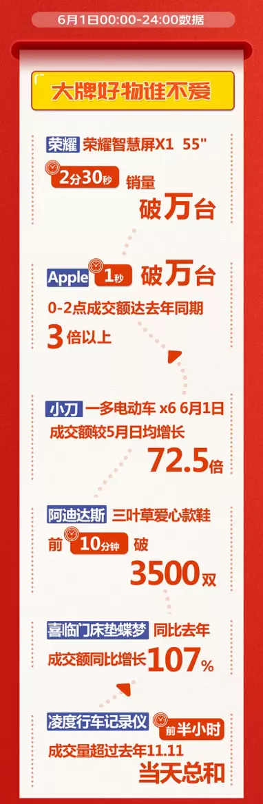Apple产品成交量1秒破万台,当天0-2点成交额达去年同期3倍以上;海尔477升变频冰箱开售10分钟成交额突破1000万。